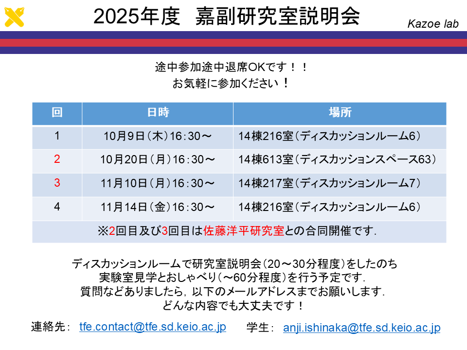| ようこそ!嘉副研究室のHPへ!嘉副研究室では、以下の日程で研究室説明会を行います。熱流体に興味がある方も無い方も、たまたま都合が空いてた人でも、どんな方でも大歓迎ですので是非来て下さい! | |||